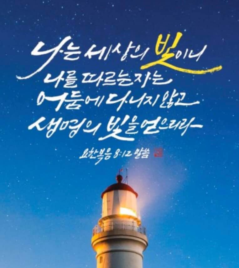 말씀 : 예수께서 또 말씀하여 이르시되 나는 세상의 빛이니 나를 따르는 자는 어둠에 다니지 아니하고 생명의 빛을 얻으리라 (요한복음 8장 12절)