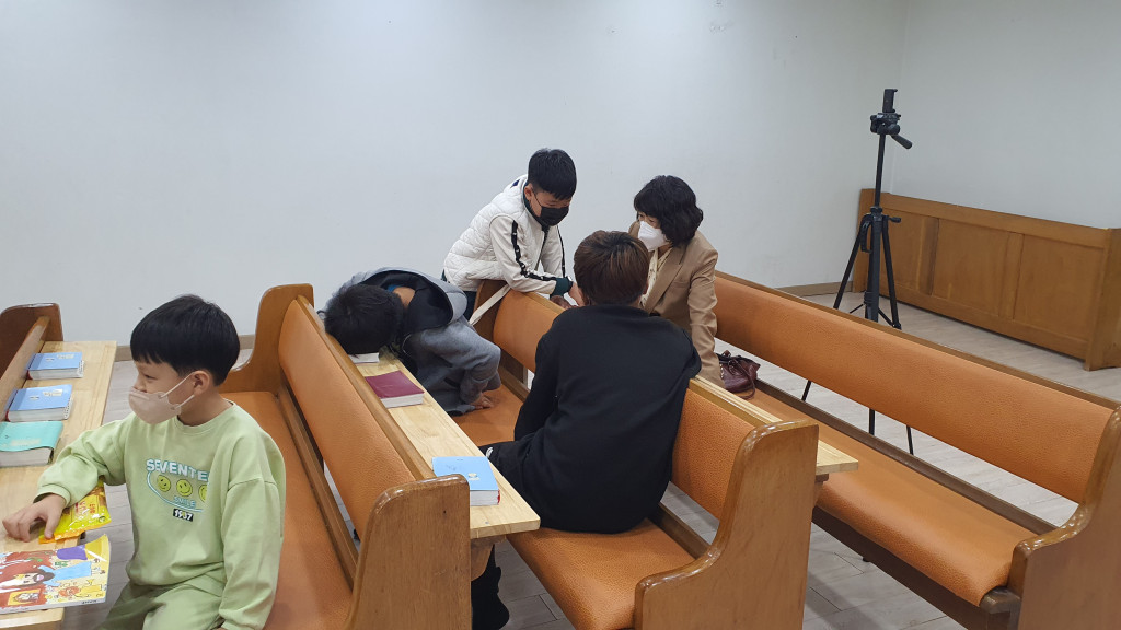 * 오늘은 6명의 아이들(박세연/박다니엘/송준혁/정희찬/정희우/김건오)과 함께 '유초등부 예배'를 드렸습니다.