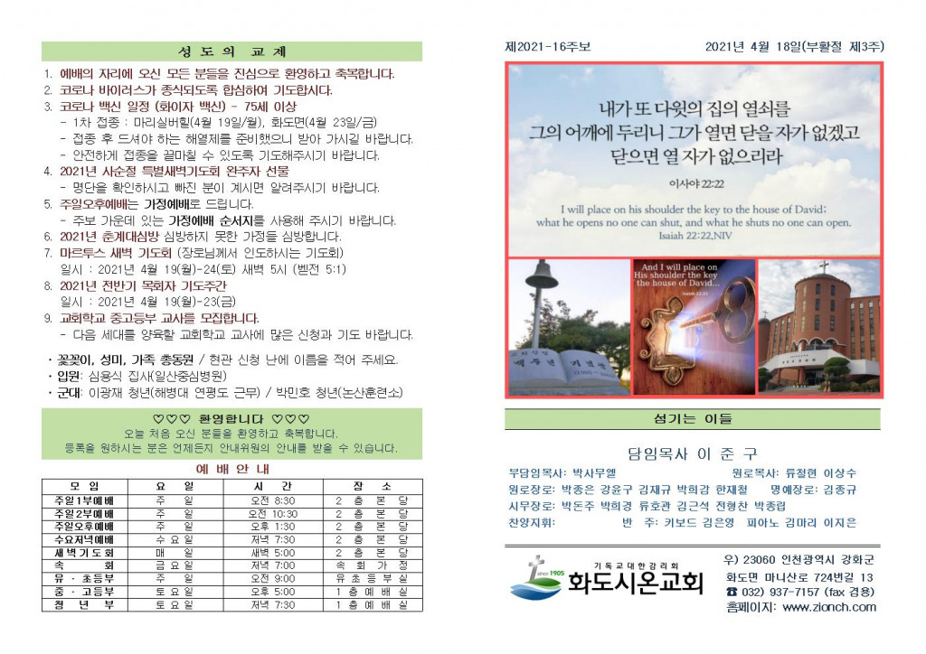 2021년 4월 18일 화도시온교회 주보