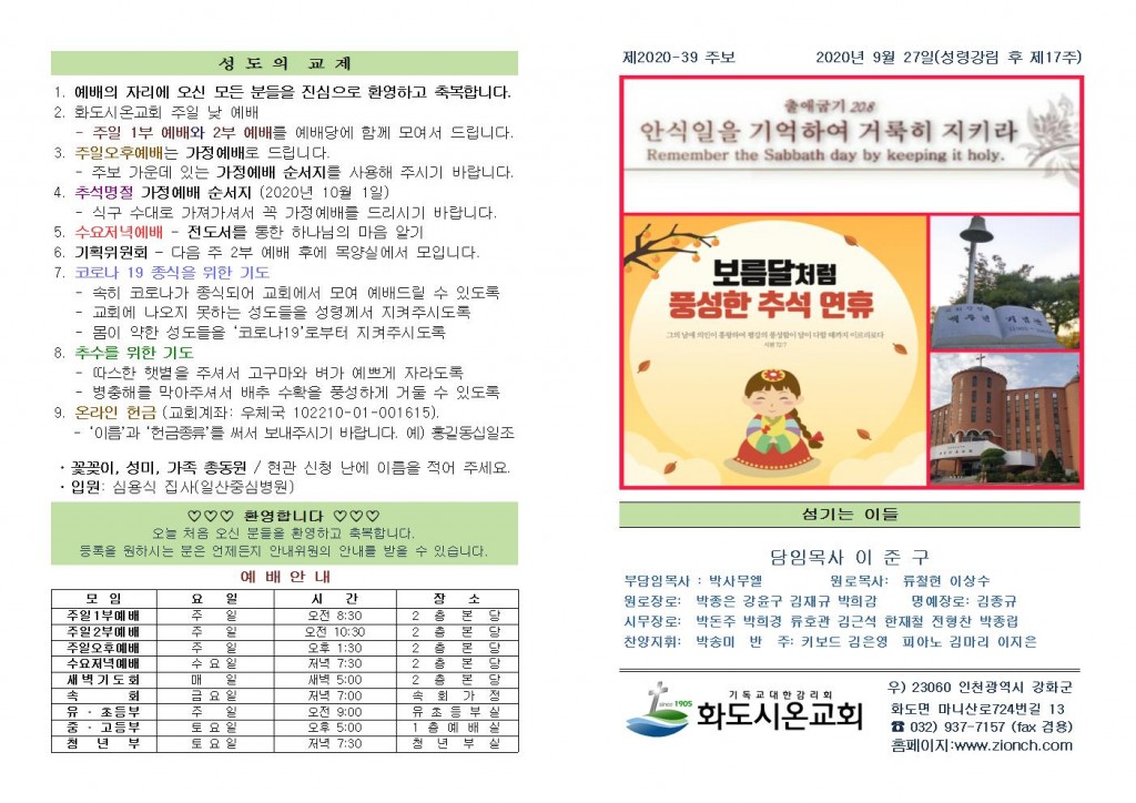 2020년 9월 20일 화도시온교회 주보