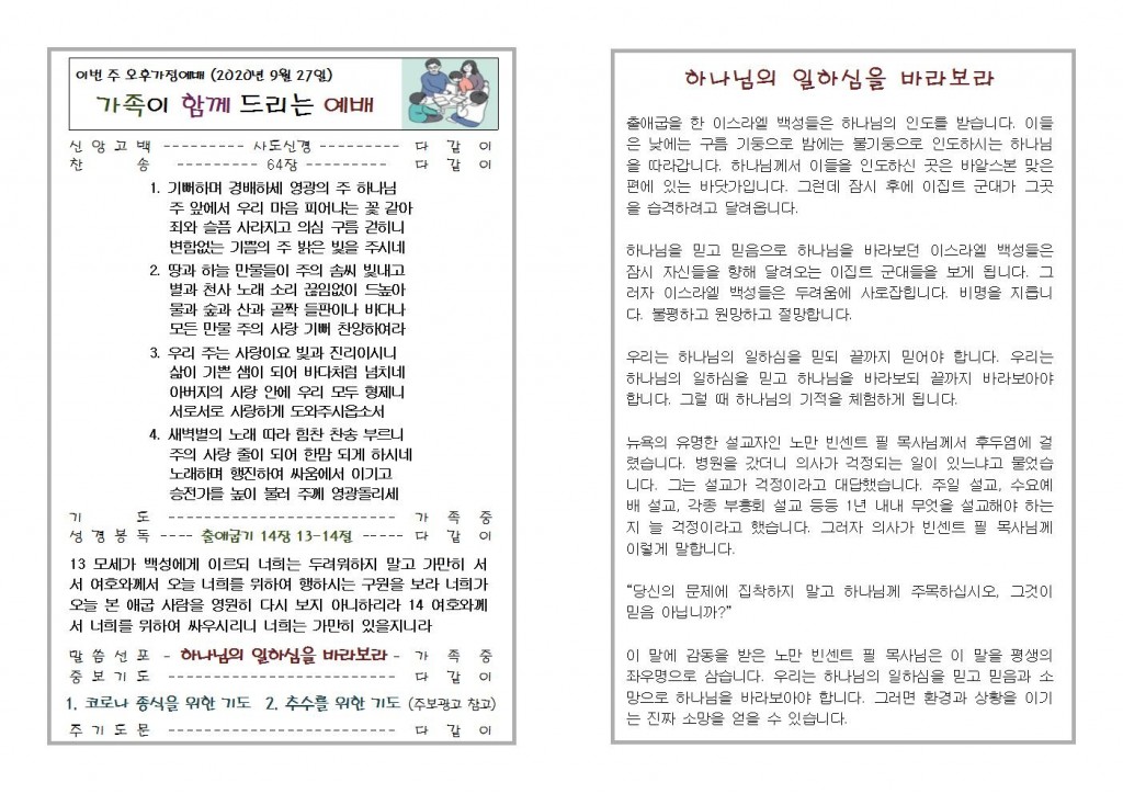 2020년 9월 27일 화도시온교회 주보