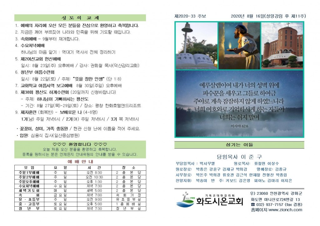 2020년 8월 16일 화도시온교회 주보