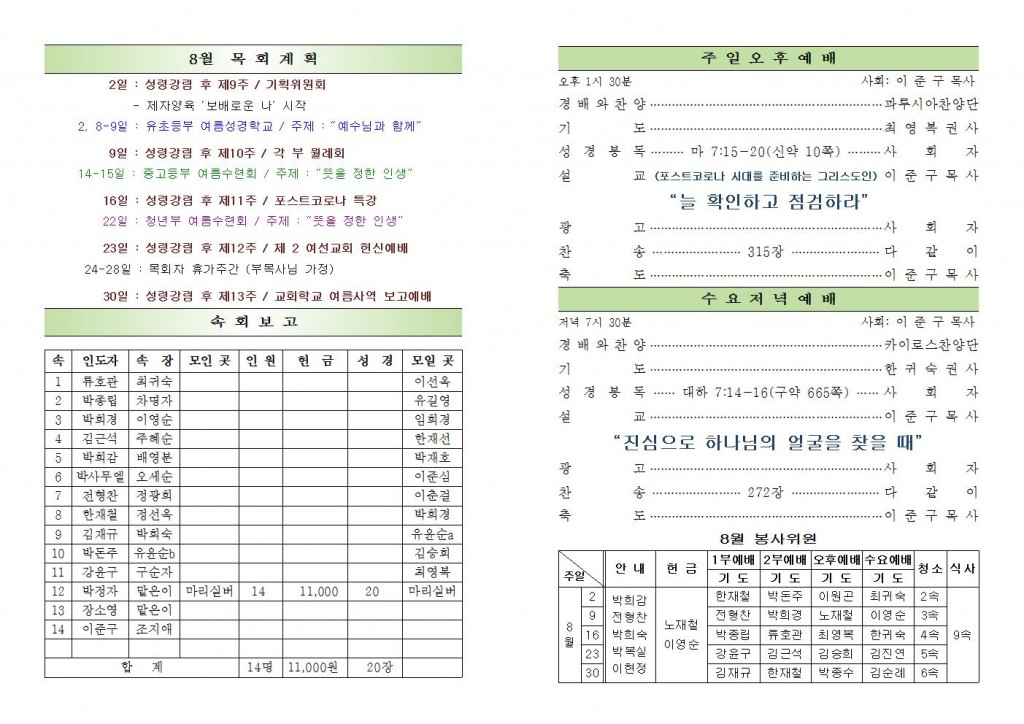 2020년 8월 2일 화도시온교회 주보