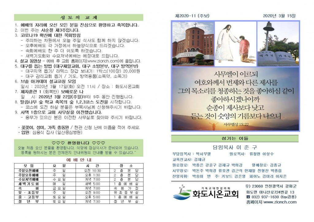 2020년 3월 15일 화도시온교회 주보