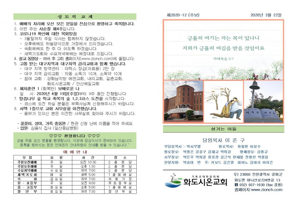 2020년 3월 22일 화도시온교회 주보