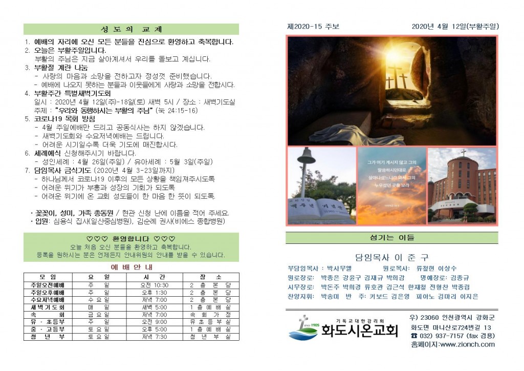 2020년 4월 12일 화도시온교회 주보