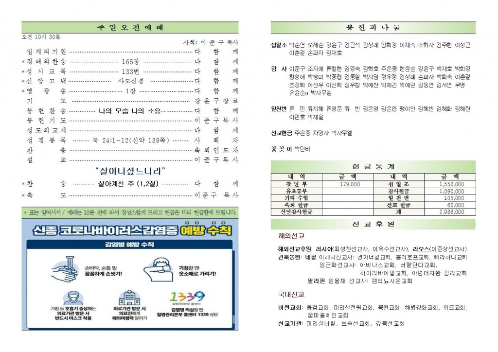2020년 3월 15일 화도시온교회 주보