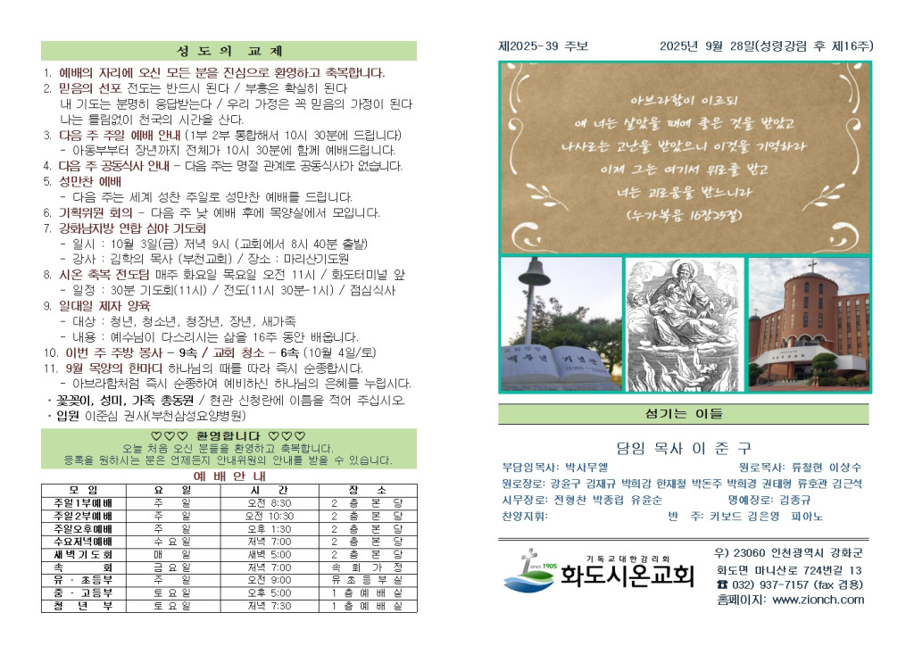 2025년 9월 21일 화도시온교회 주보