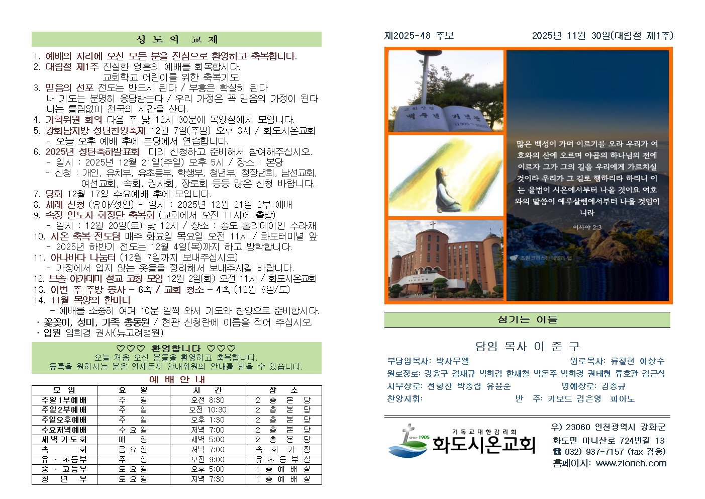 2025년 11월 30일 화도시온교회 주보