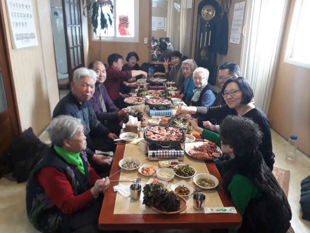 (2019년 봄 대심방 후 식사) 11속 이남녀 권사님의 팔순 생일 잔치로 함께 식사했습니다.