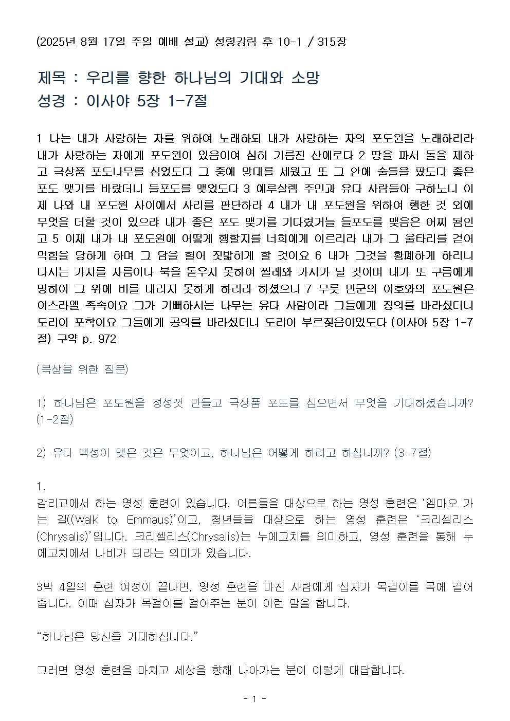 (성령강림 후 10-1) 우리를 향한 하나님의 기대와 소망 (설교문)