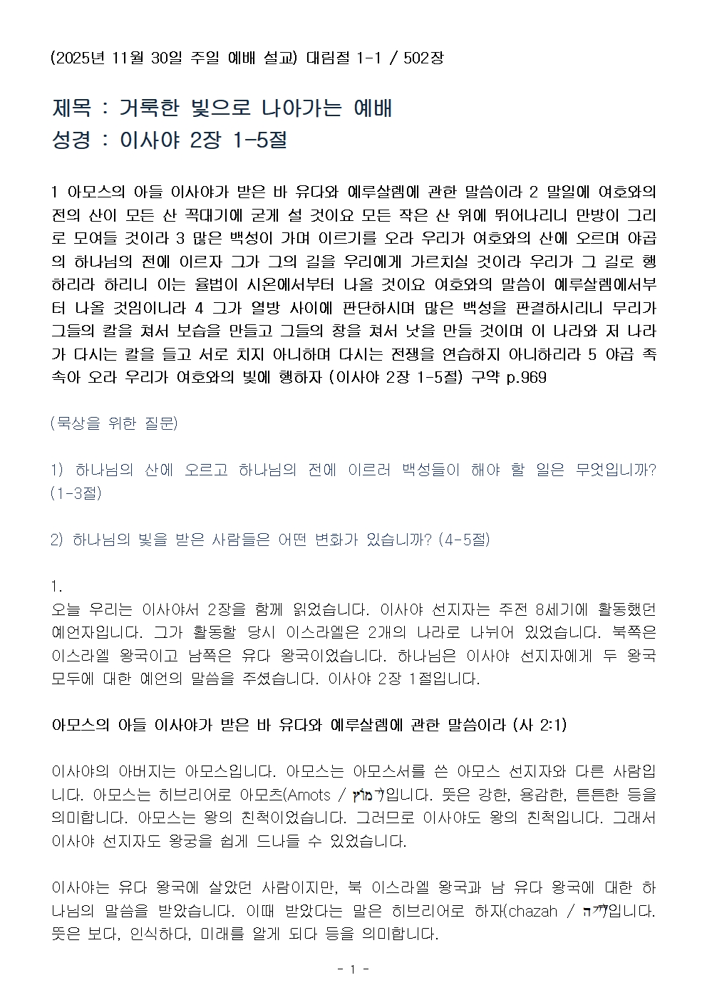 (대림절 1-1) 거룩한 빛으로 나아가는 예배 (설교문)