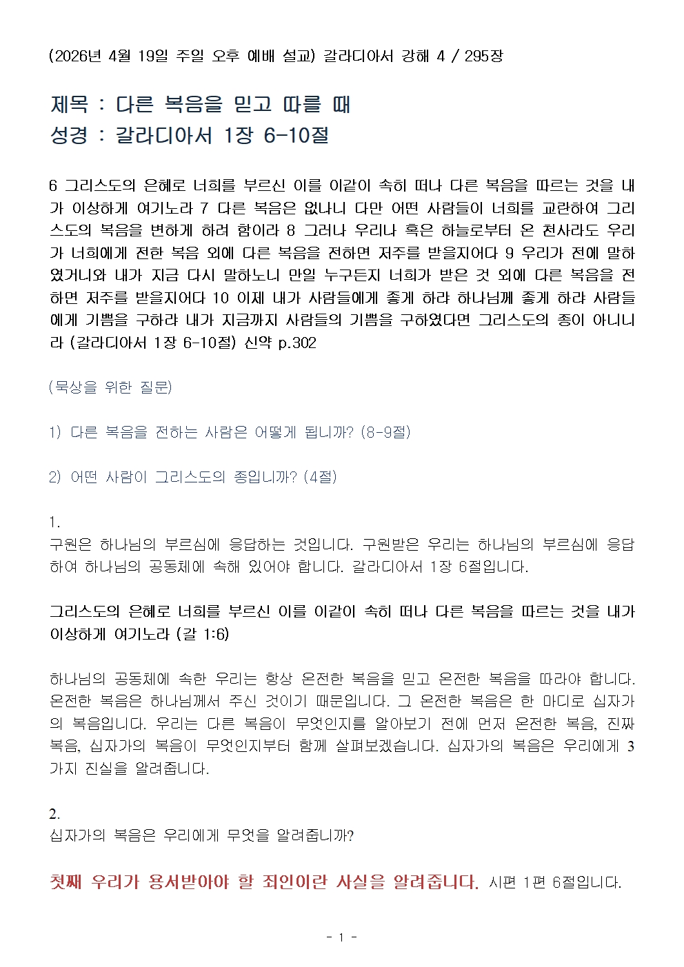 (갈라디아서 강해 4) 다른 복음을 믿고 따를 때 (설교문)