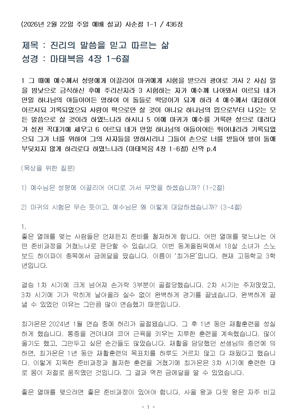 (사순절 1-1) 진리의 말씀을 믿고 따르는 삶 (설교문)