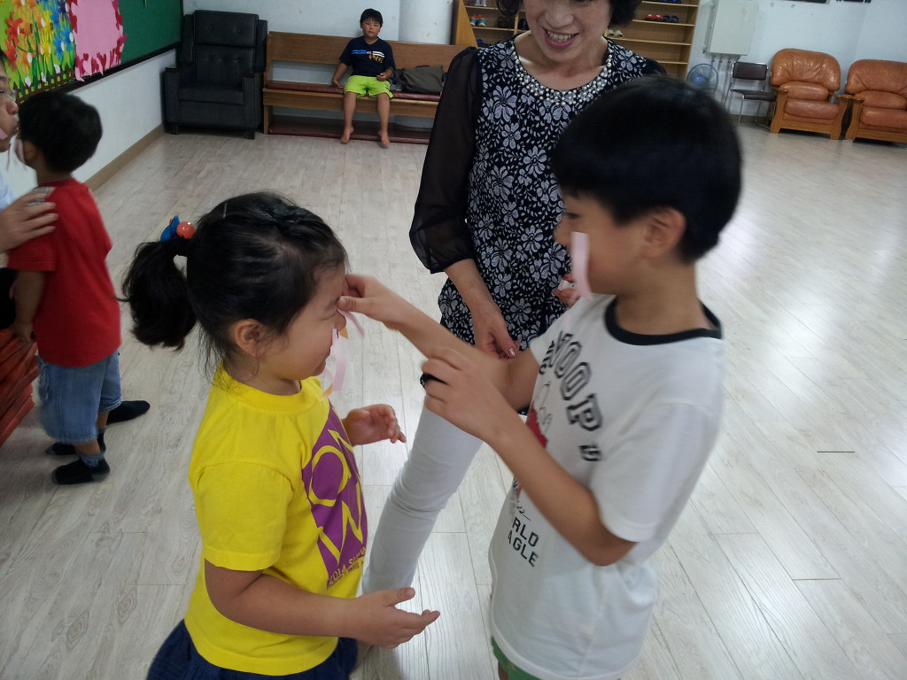 서로 얼굴에 포스트잍 붙여주고, 누가 먼저 손 안대고 빨리 떼어내나~