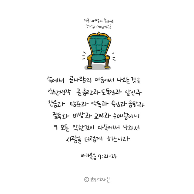 말씀 : 21 속에서 곧 사람의 마음에서 나오는 것은 악한 생각 곧 음란과 도둑질과 살인과 22 간음과 탐욕과 악독과 속임과 음탕과 질투와 비방과 교만과 우매함이니 23 이 모든 악한 것이 다 속에서 나와서 사람을 더럽게 하느니라 (마가복음 7장 21-23절)