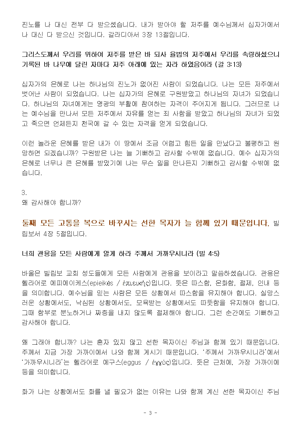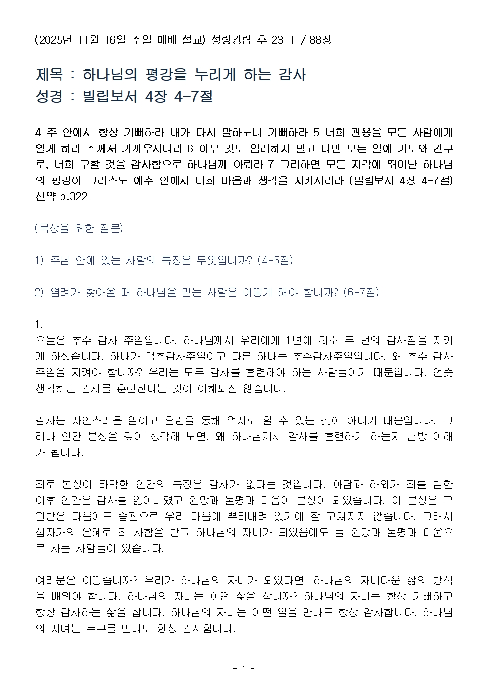 (성령강림 후 23-1, 추수감사주일) 하나님의 평강을 누리게 하는 감사 (설교문)