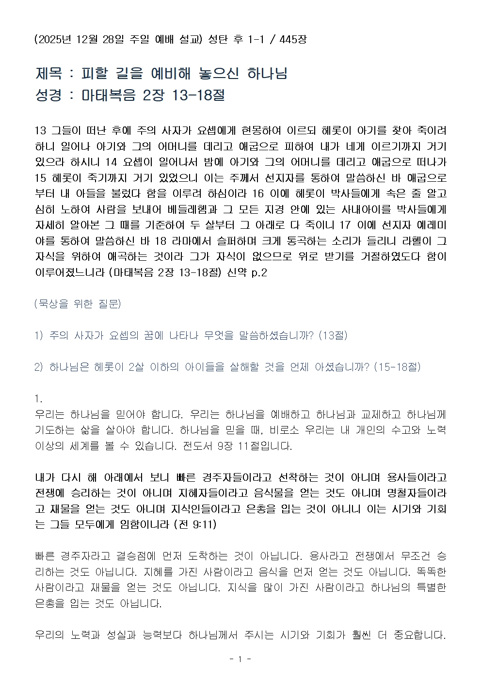 (성탄 후 1-1) 피할 길을 예비해 놓으신 하나님 (설교문)