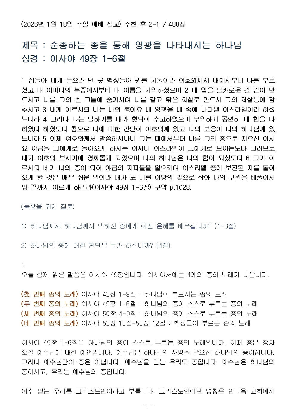(주현 후 2-1) 순종하는 종을 통해 영광을 나타내시는 하나님 (설교문)