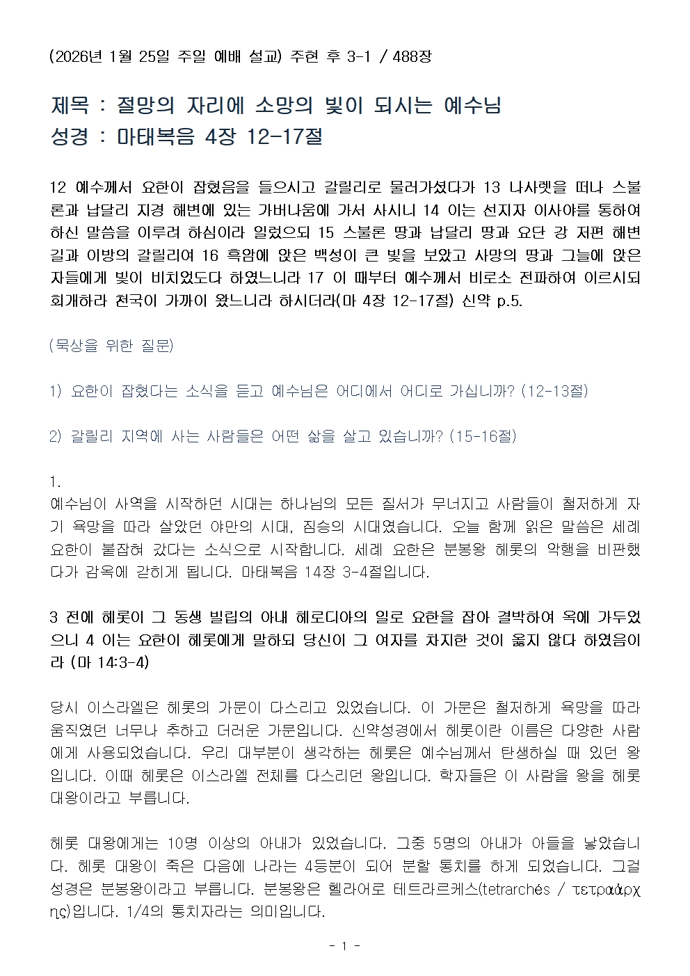 (주현 후 3-1) 절망의 자리에 소망의 빛이 되시는 예수님 (설교문)