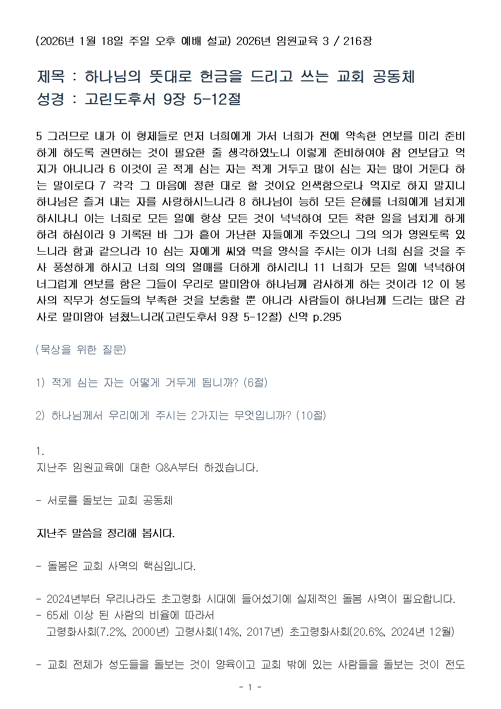 (2026 임원교육 3) 하나님의 뜻대로 헌금을 드리고 쓰는 교회 공동체 (설교문)