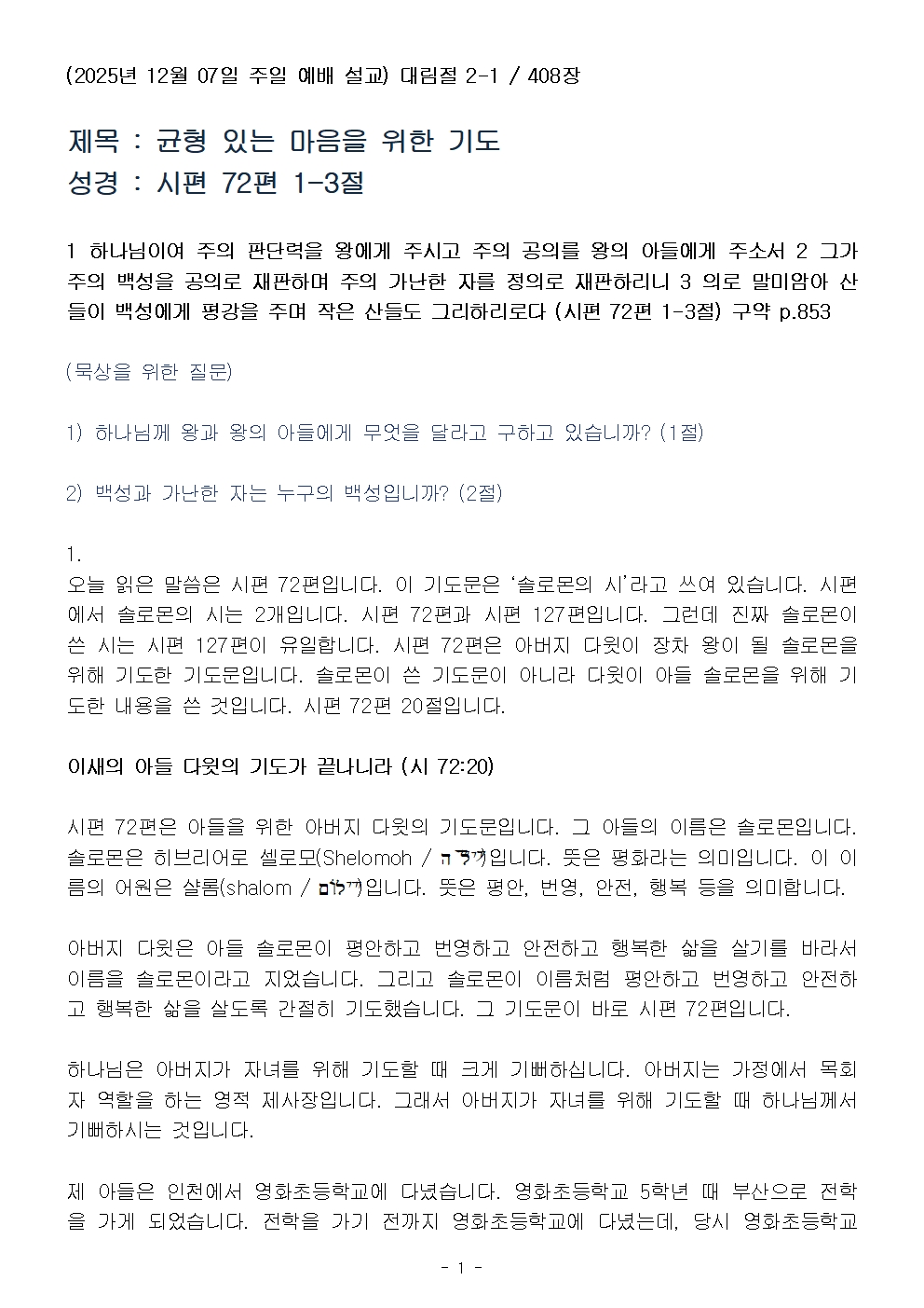 (대림절 2-1) 균형 있는 마음을 위한 기도 (설교문)